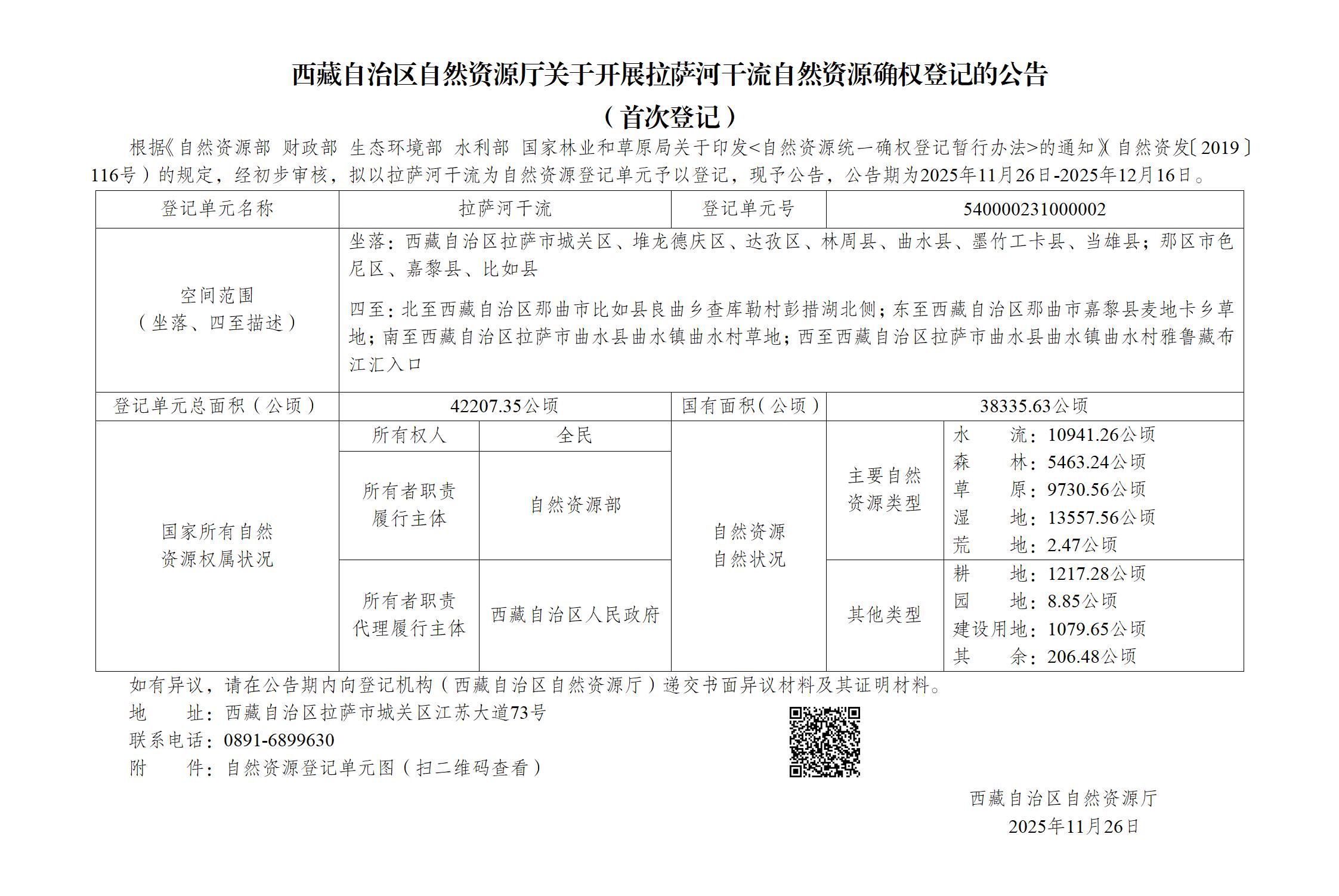 西藏自治区自然资源厅关于开展拉萨河干流自然资源确权登记的公告